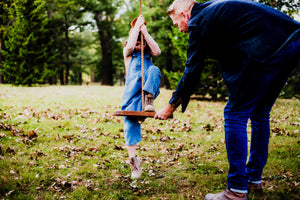When we first started making our swings, we had a little booth at our local farmers’ market. Nestled right between a flower vendor and a vegetable stall, it was absolutely perfect! We rolled out astroturf for grass, put a little white picket fence around the borders of our booth, and hung one of our disc-style swings from the awning overhanging the booths. Every Saturday and Sunday, we would chat with people while children took turns swinging. Sometimes even the moms and dads would jump on and join in the fun. Grandparents would often stand by, watching with far-off looks in their eyes, and tell stories about the tree swings they had as children.